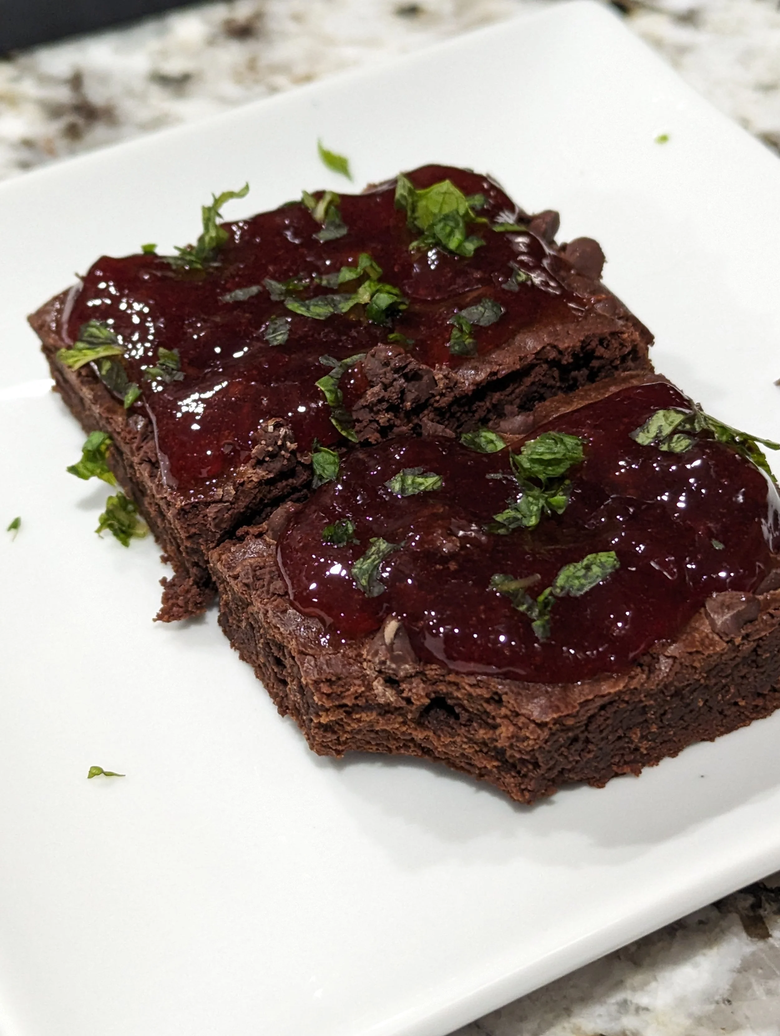 Dense Brownie, with Strawberry Habanero Jelly and Fresh Torn Mint
