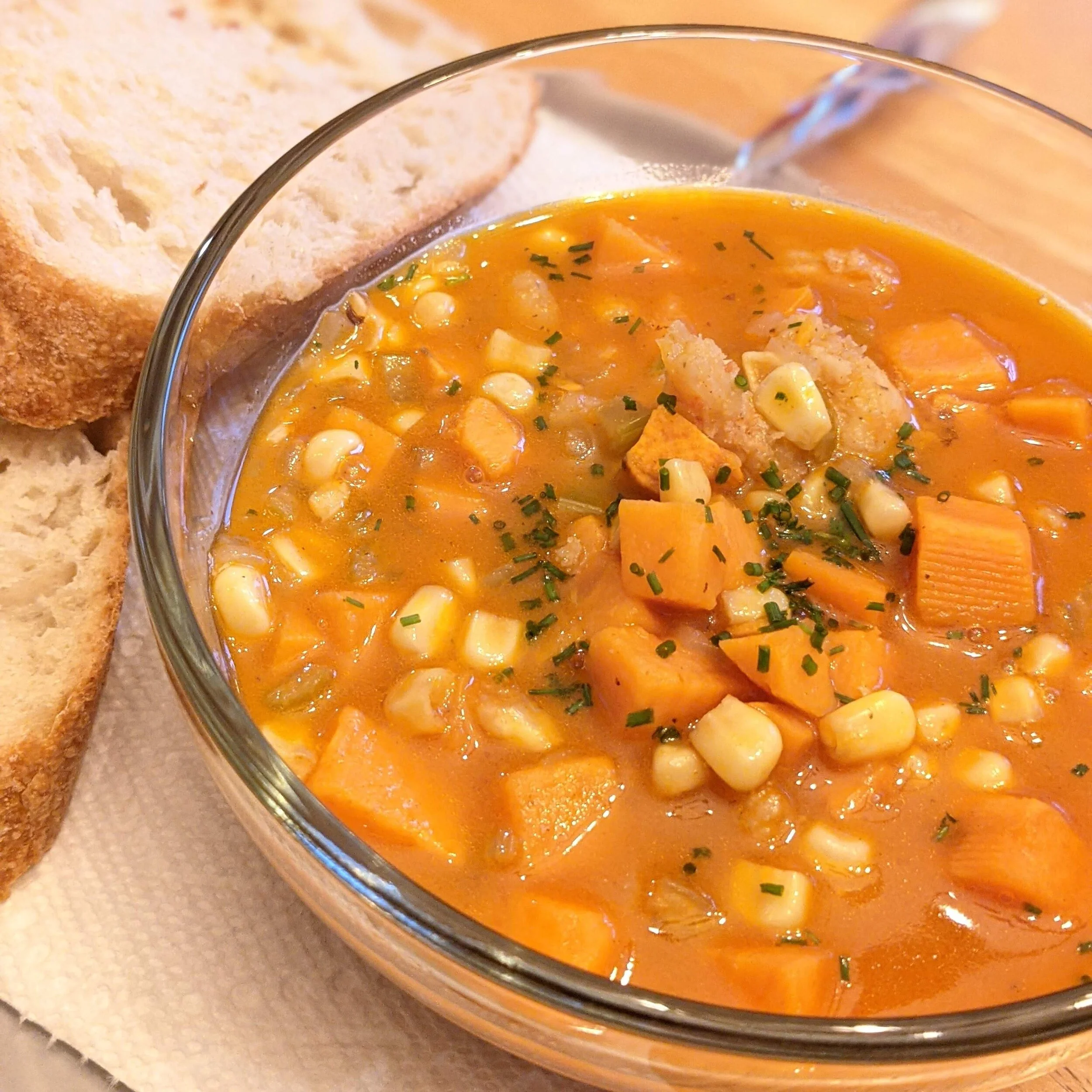 - Add paprika, chicken stock, sweet potatoes, salt, and pepper to saucepot. Stir to combine, increase heat to medium-high, bring to boil, reduce to simmer, simmer until potatoes fork tender, approximately 15 minutes. Add frozen corn kernels, return to simmer, simmer additional 15 minutes. Remove from heat, add heavy cream of choice, and stir to combine.